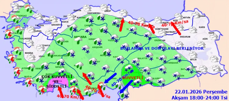 ANKARA (İGFA) - Meteoroloji Genel Müdürlüğü, 22 Ocak Perşembe gününe ilişkin hava tahmin raporunu yayımladı.