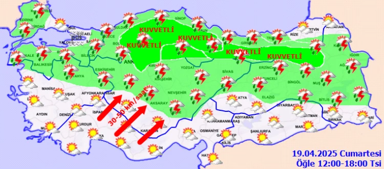 İSTANBUL (İGFA) - Meteoroloji Genel Müdürlüğü tarafından yapılan tahminlere göre: Ülkemizin kuzey ve iç kesimlerinin parçalı ve çok bulutlu, yarın (Cumartesi) Marmara’nın güney ve batısı, İç Anadolu’nun kuzeyi, Batı ve Orta Karadeniz, Doğu Karadeniz’in iç kesimleri, Ardahan dışında Doğu Anadolu’nun kuzeyi ile Kocaeli, Sakarya, Kütahya, Giresun, Trabzon, Aksaray, Niğde, Bitlis, Elazığ ve Van çevrelerinin sağanak ve gök gürültülü sağanak yağışlı, diğer yerlerin az bulutlu ve açık geçeceği tahmin ediliyor. Yağışların, Ankara’nın kuzey ve doğusu, Çankırı, Bolu’nun doğusu, Karabük, Kastamonu, Çorum, Amasya, Tokat, Gümüşhane, Bayburt ve Erzurum çevrelerinde yerel kuvvetli olması bekleniyor. Gece ve sabah saatlerinde Marmara ve Karadeniz çevrelerinde sis ve pus hadisesi bekleniyor. Rüzgarın,yarın öğle saatlerinde İç Anadolu'nun güney kesimlerinde güney yönlerden (30-50 km/saat) kuvvetli esmesi tahmin ediliyor.