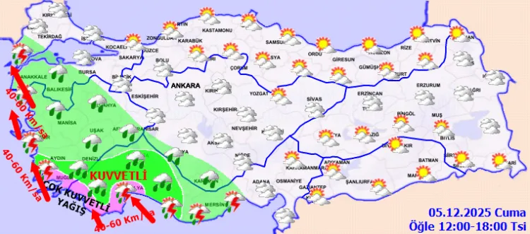 ANKARA (İGFA) - Meteoroloji Genel Müdürlüğü’nden yapılan son açıklamaya göre, 5 Aralık 2025 Cuma günü sabah saatlerinden itibaren bazı bölgelerde kuvvetli ve yer yer şiddetli yağışlar görülecek.