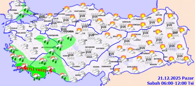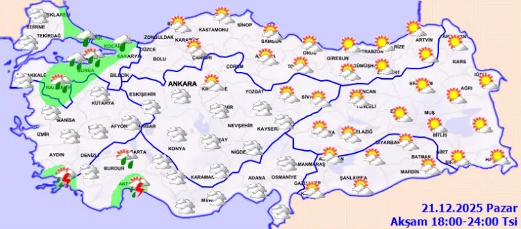 Buna göre, Marmara'nın doğusu, Batı Akdeniz, Tekirdağ, İzmir, Aydın, Muğla, Afyonkarahisar, Kütahya, Zonguldak, Bolu, Düzce, Erzincan, Tunceli çevreleri, Kırklareli'nin kıyı kesimleri, Ankara ve Eskişehir’in güneyi, Konya’nın kuzey ve batısı ile Erzurum'un batısının yağmur ve sağanak yağışlı, Güney Ege kıyıları ile Batı Akdeniz kıyılarının gök gürültülü sağanak yağışlı geçeceği tahmin ediliyor. Yağışların; Muğla ve Antalya çevrelerinde yerel kuvvetli olması bekleniyor. Sabah ve gece saatlerinde iç ve doğu bölgelerde pus ve yer yer sis bekleniyor.