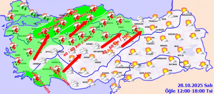 Meteoroloji'den alınan bilgiye göre bugün Batı Karadeniz, Marmara ve Ege’de sağanak yağış etkili olacak. Rüzgar ise hava tahmin verilerine göre, 60 km/sa hızla esecek.