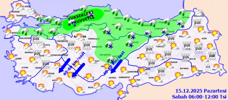 Sabah ve gece saatlerinde iç ve doğu kesimlerde pus ve yer yer sis hadisesi tahmin ediliyor. Rüzgarın, Akdeniz’in iç kesimlerinde rüzgarın kuzey kuzeydoğu yönlerden kuvvetli (40-60 km/sa) esmesi bekleniyor.