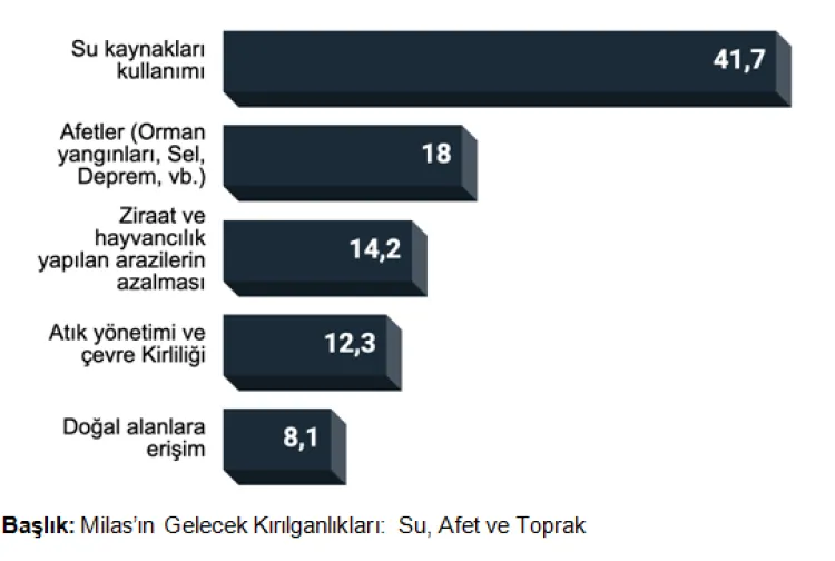 Araştırmaya göre Milas’ta gelecekte en fazla yaşanacağı düşünülen çevresel sorunların başında su kaynaklarına ilişkin riskler geliyor. Afetler, üretim alanlarının daralması ve çevre kirliliği de öncelikli kaygı başlıkları arasında yer alıyor.