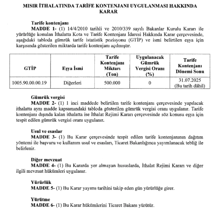 Cumhurbaşkanı Recep Tayyip Erdoğan’ın imzasını taşıyan karar, 31 Temmuz 2025 tarihine kadar 500 bin ton mısır ithalatı için tarife kontenjanı açılmasını öngörüyor.
