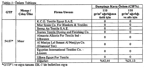 Mısır’da yerleşik Almasria Alkoria For Textile Ind – Ulhwatex, Al Masiya Lel Senaat Al Nasijiya Co. (Diamond Tex), Egyptian International Textiles Co. – Liontex, K.C.G. Textile Egypt S.A.E., Misr Spain Co. For Blankets & Textiles, Seong An Textile S.A.E., Startex Textile Dyeing and Finishing Co. ve Ulhwa Egypt For Textile firmaları, üretici/ihracatçı belgesi sundukları takdirde bu önlemlerden muaf olacak.