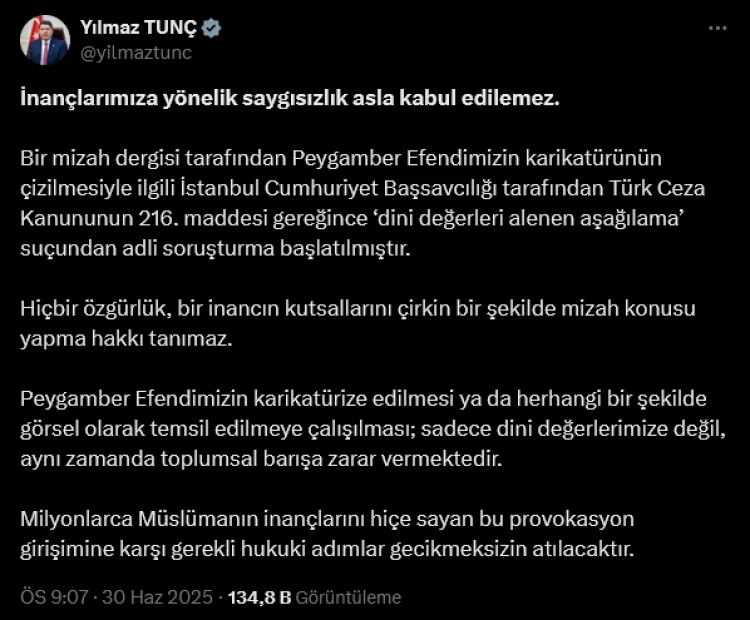 Bakan Tunç, sosyal medya hesabından yaptığı paylaşımda, “İnançlarımıza yönelik saygısızlık asla kabul edilemez. Hiçbir özgürlük, bir inancın kutsallarını çirkin bir şekilde mizah konusu yapma hakkı tanımaz” diyerek, Peygamber Efendimizin karikatürize edilmesinin sadece dini değerlere değil, toplumsal barışa da zarar verdiğini vurguladı.