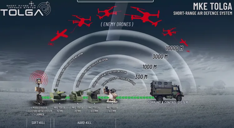 ANKARA (İGFA) - Makine ve Kimya Endüstrisi (MKE) tarafından geliştirilen TOLGA Yakın Hava Savunma Sistemi (YHSS), alçak irtifa hava tehditlerine karşı bütünleşik ve çok katmanlı bir savunma mimarisi sunuyor. Sistem, kritik tesisler ve stratejik alanların güvenliğinin kesintisiz sağlanmasına yönelik olarak tasarlandı.