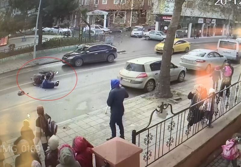 Tekirdağ Çorlu’da motosikletli kurye, okuldan çıkarken yaya geçidini kullanan 7 yaşındaki yabancı uyruklu 1. sınıf öğrencisine çarptı. 2 kişinin yaralandığı kaza anı kameraya yansıdı.