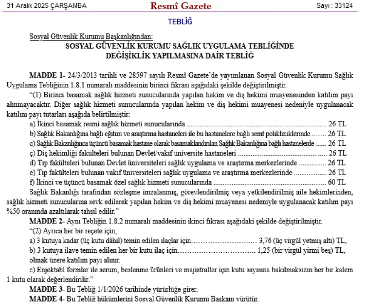 Bugünkü Resmi Gazete’de yayımlanan tebliğle, hekim muayenesi ve reçete katılım paylarında düzenlemeye gidildi. Yeni uygulama 1 Ocak 2026’da yürürlüğe girecek.