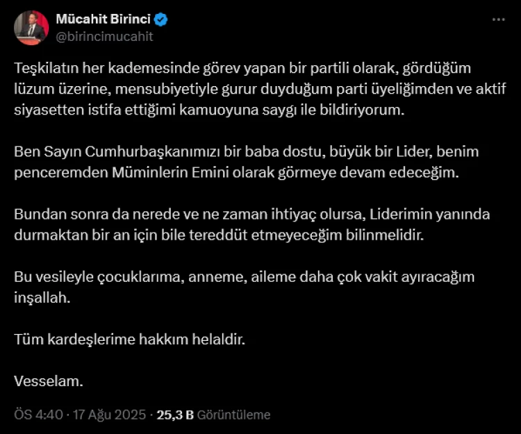 AK Parti’de çeşitli kademelerde görev yapan Mücahit Birinci, parti üyeliğinden ve aktif siyasetten istifa ettiğini duyurdu. Av. Birinci, Cumhurbaşkanı Recep Tayyip Erdoğan’a olan bağlılığını vurgulayarak, “Bundan sonra da Liderimin yanında durmaktan tereddüt etmeyeceğim” dedi.