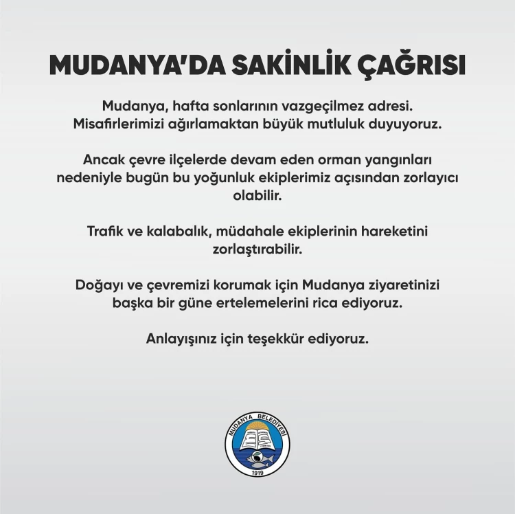 Açıklamada, “Mudanya, hafta sonlarının vazgeçilmez adresi. Misafirlerimizi ağırlamaktan mutluluk duyuyoruz. Ancak çevre ilçelerde devam eden orman yangınları nedeniyle bugün bu yoğunluk ekiplerimiz açısından zorlayıcı olabilir. Trafik ve kalabalık, müdahale ekiplerinin hareketini zorlaştırabilir. Doğayı ve çevremizi korumak için Mudanya ziyaretinizi başka bir güne ertelemelerini rica ediyoruz. Anlayışınız için teşekkür ederiz” ifadeleri yer aldı.