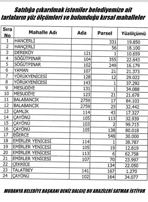 Satışa konu parsellerin ilçenin kırsal mahallelerinden Çayönü, Yörükyenicesi, Emirleryenicesi, Söğütpınar, Yaman, Eğerce, Dereköy, Hançerli, Mesudiye, Çekrice, Trilye ve Balabancık’taki tarlalar olduğunu belirten AK Parti Mudanya İlçe Başkanı Av. Arif Bayrak, "Bunlar köylünün, çiftçinin nefesi; Mudanya’nın gıda güvenliği ve ekonomisinin teminatı. ‘Atıl’ diye değersizleştirerek satmak, yarın üretimden, kırsaldan bahsetme hakkını da elinizden alacak” diyerek sert çıktı.