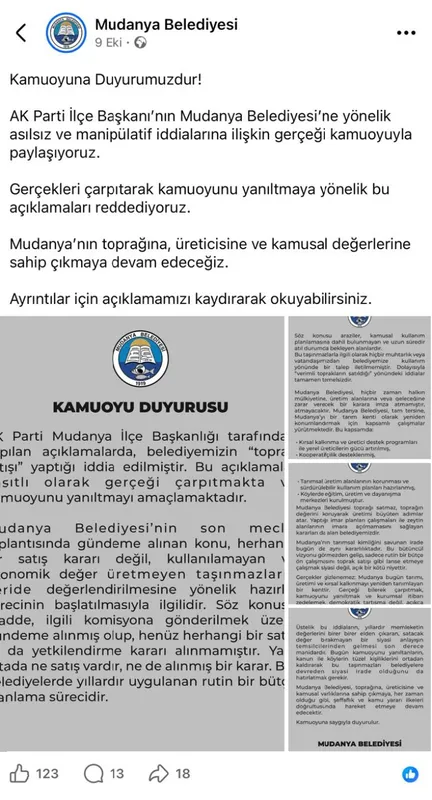 AK Parti Mudanya İlçe Başkanı Arif Bayrak, Mudanya Belediyesi’nin taşınmaz satışlarına ilişkin kamuoyunu yanılttığını öne sürdü. Bayrak, daha önce “yalan” denilen satış iddialarının, belediyenin kendi internet sitesinde yayımlanan ihale ilanıyla doğrulandığını söyledi. Av. Bayrak’ın açıklamasına göre; Çayönü, Yörükyenicesi, Balabancık, Dereköy ve Tirilye mahallelerinde bulunan toplam 328 bin 588 metrekarelik 8 taşınmazın 5 Ocak 2026 tarihinde 2886 sayılı Devlet İhale Kanunu kapsamında kapalı teklif usulüyle satışa çıkarıldığını bildirdi.