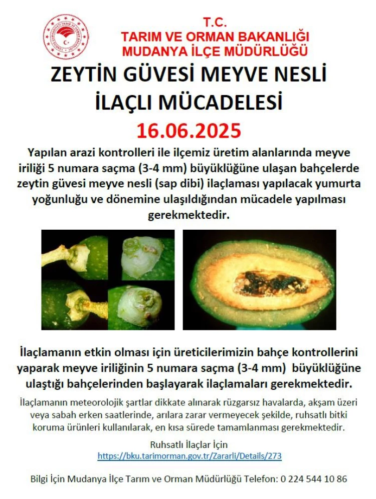Yapılan arazi kontrolleri sonucunda, üretim alanlarında meyve iriliğinin saçma büyüklüğüne ulaştığı bahçelerde zeytin güvesi (meyve nesli, sap dibi) ilaçlamasına başlandığını kaydeden Müdürlük, üreticilerin bahçe kontrollerini yaparak meyve iriliğinin 3-4 mm büyüklüğüne ulaştığı bahçelerden başlayarak ilaçlama yapılmasını önerdi.
