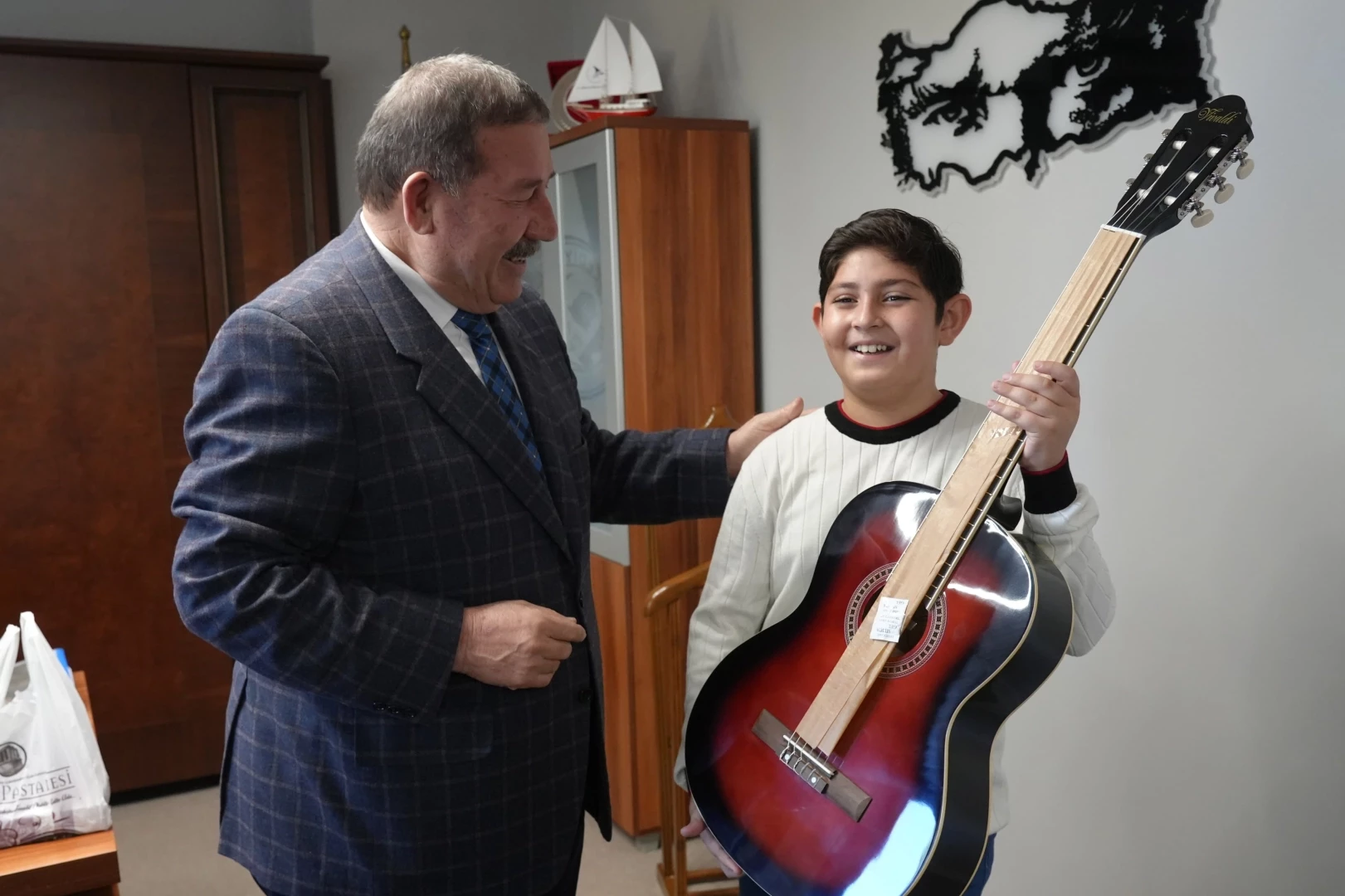 Muğla'ya bağlı Milas Belediye Başkanı Fevzi Topuz, kendisinden gitar talebinde bulunan öğrenci Baha Doruk Serin’in isteğini yerine getirerek hediyesini takdim etti.