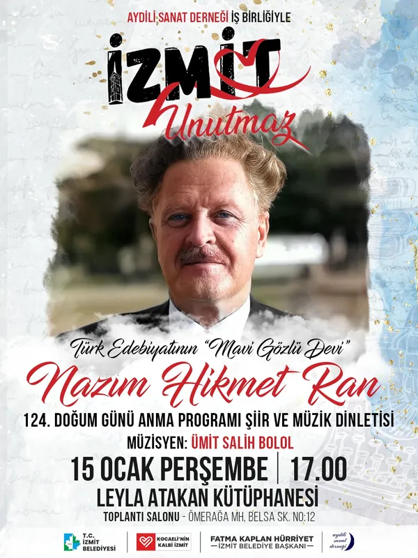 İzmit Belediyesi, "İzmit Unutmaz" etkinlikleri kapsamında Türk edebiyatının simge isimlerinden Nazım Hikmet Ran'ı 124'üncü doğum gününde özel bir program ile anacak. Aydili Sanat Derneği'nin katkılarıyla düzenlenecek etkinlikte Nazım Hikmet'in unutulmaz şiirleri ve müzisyen Ümit Salih Bolol'un duygusal tınıları bir araya gelecek.