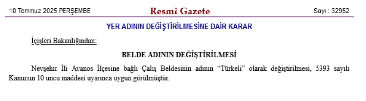 ANKARA (İGFA) - İçişleri Bakanlığı tarafından, Nevşehir’in Avanos ilçesine bağlı Çalış Beldesi’nin adının “Türkeli” olarak değiştirilmesine dair karar, Resmi Gazete’de yayımlanarak yürürlüğe girdi.