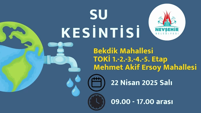 Nevşehir’in Bekdik ve Mehmet Akif Ersoy Mahallesi’ndeki içme suyu şebeke hattında ki yenileme ve bağlantı çalışması sebebiyle su kesintisi yaşanacak.