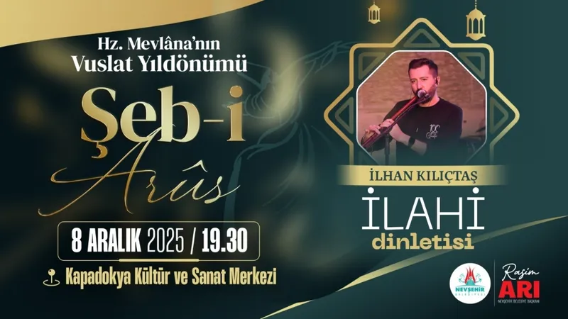 Nevşehir Belediyesi Kültür, Sanat ve Sosyal İşler Müdürlüğü tarafından organize edilen Şeb-i Arus İlahi Dinletisi, 8 Aralık 2025 Pazartesi günü gerçekleştirilecek.