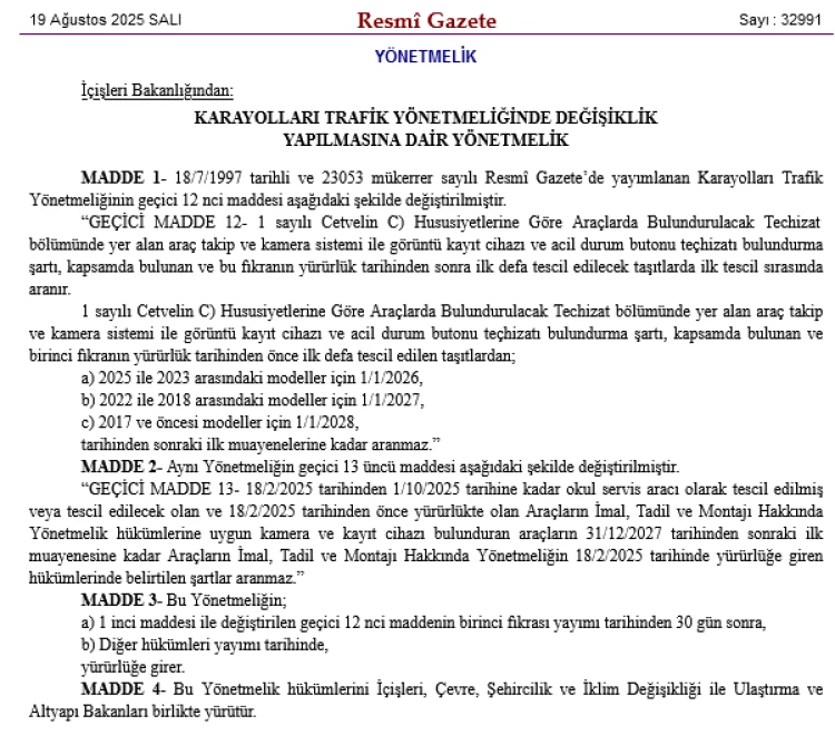 ANKARA (İGFA) - Karayolları Trafik Yönetmeliği'ndeki ana değişiklikler yönetmeliğin 'Geçici Madde 12'deki 1 sayılı Cetvel’in C bölümünde belirtilen araç takip sistemi, kamera, görüntü kayıt cihazı ve acil durum butonu teçhizatında oluken, 30 gün sonra ilk kez tescil edilecek araçlarda zorunlu olması kararlaştırıldı.