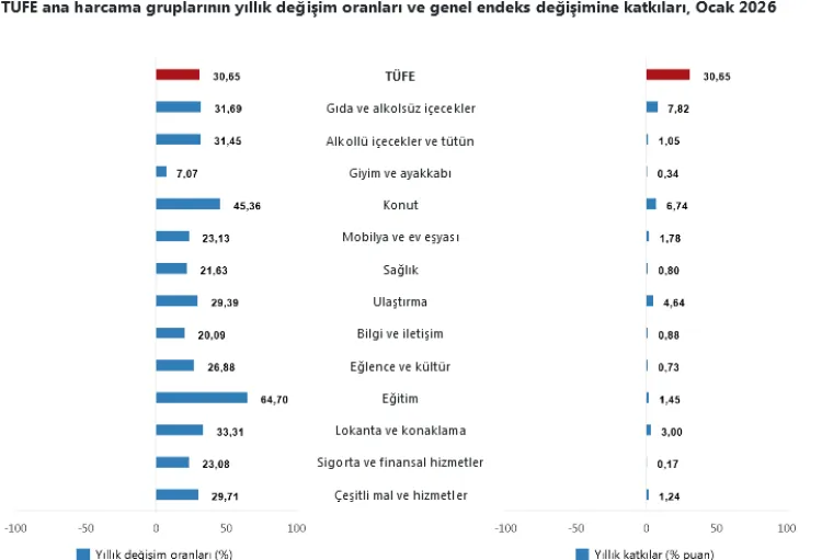 TÜFE verilerine göre ana harcama gruplarındaki artış; Ocak ayında TÜFE’de en yüksek ağırlığa sahip üç harcama grubunun yıllık değişimlerinde; gıda ve alkolsüz içecekler yüzde 31,69, ulaştırma yüzde 29,39, konut, su, elektrik, gaz ve diğer yakıtlar ise yüzde 45,36 oldu.