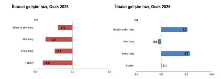 Ocak 2026’da ihracat geçen yılın aynı ayına göre yüzde 4 azalırken, ithalat yüzde 0,1 arttı. Dış ticaret açığı yüzde 11,6 yükselerek 8 milyar 380 milyon dolara çıktı. Veriler, yılın ilk ayında dış ticaret dengesinde zayıflamanın sürdüğünü ortaya koydu.