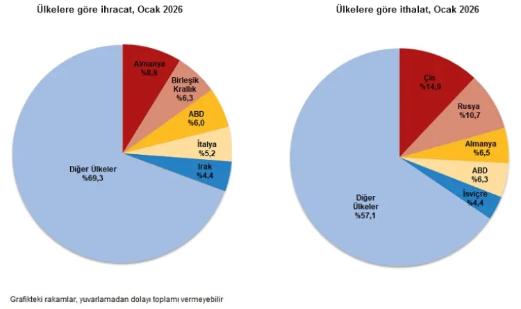 Ocak ayında en fazla ihracat 1 milyar 780 milyon dolar ile Almanya’ya yapıldı. Bu ülkeyi Birleşik Krallık, ABD, İtalya ve Irak izledi. İlk beş ülkeye yapılan ihracat, toplamın yüzde 30,7’sini oluşturdu. İthalatta ise ilk sırayı 4 milyar 283 milyon dolar ile Çin aldı. Çin’i Rusya Federasyonu, Almanya, ABD ve İsviçre takip etti. İlk beş ülkeden yapılan ithalat toplam ithalatın yüzde 42,9’unu oluşturdu.