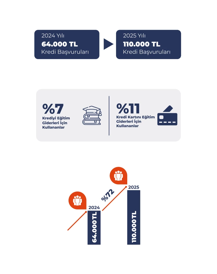 Okul dönemi öncesinde kredi başvurularında gözlemlediğimiz yüzde 72'lik artış, enflasyonun çok üzerinde gerçekleştiğini ifade eden Zararsız, "Bu tablo, ailelerin eğitim harcamalarını karşılayabilmek için krediye geçen yıla oranla daha yoğun şekilde yöneldiğini ortaya koyuyor. 20 bin kişiyle yaptığımız anketin sonucunda, bu dönemde kredi kullananların yüzde 7'lik kesimi krediyi eğitim için kullandığını belirtiyor. Yine aynı dönemde yüzde 11'lik kitlenin kredi kartlarını eğitim harcamaları için kullandığını ortaya koyuyor. Eğitim giderleri; kırtasiye, giyim, servis ve barınma gibi çok sayıda kalemde aileler için finansal destek ihtiyacı yaratıyor. Bu nedenle finansmana erişim, veliler için her zamankinden daha kritik hale geliyor" diye konuştu.