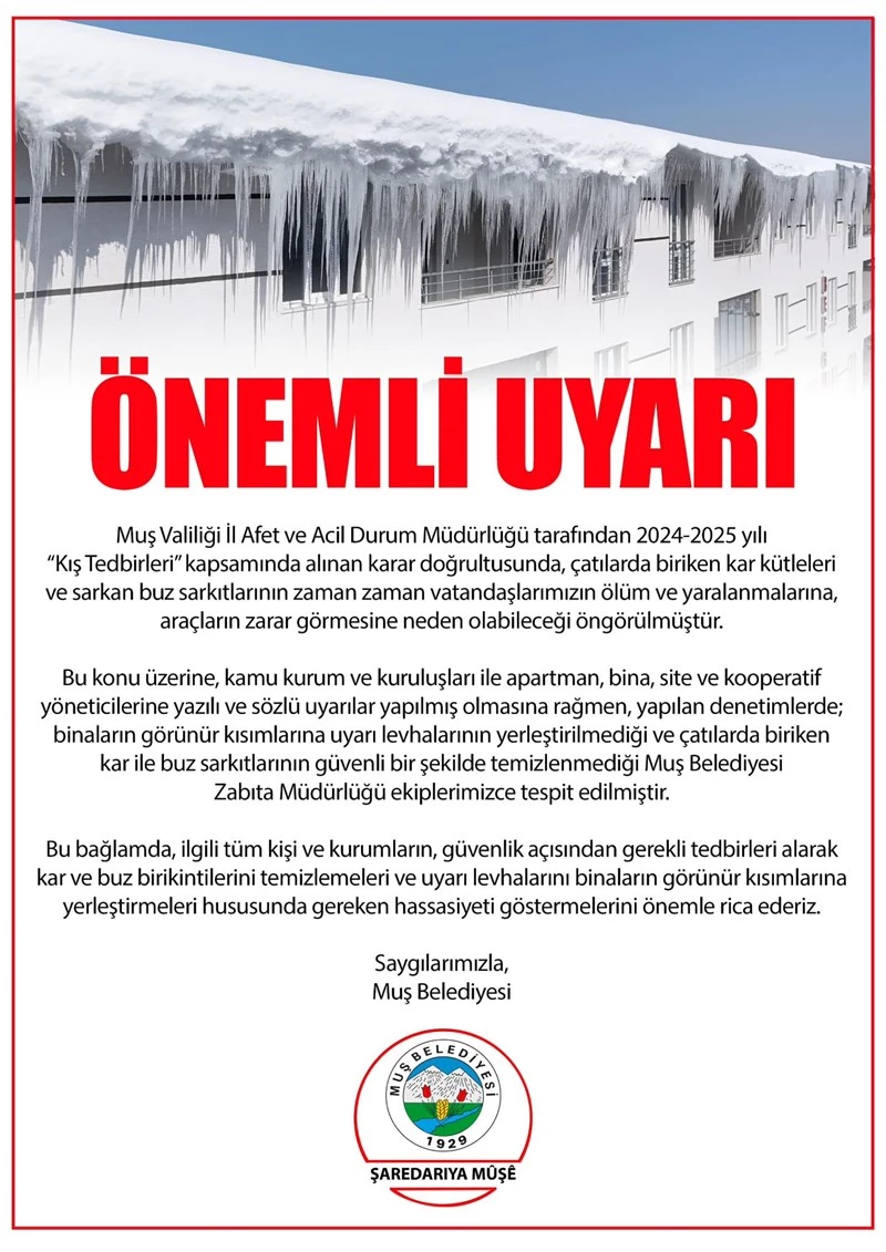 Muş Valiliği İl Afet ve Acil Durum Müdürlüğü tarafından 2024-2025 yılı “Kış Tedbirleri” kapsamında alınan karar doğrultusunda, çatılarda biriken kar kütleleri ve sarkan buz sarkıtlarının zaman zaman vatandaşlarımızın ölüm ve yaralanmalarına, araçların zarar görmesine neden olabileceği öngörülmüştür.