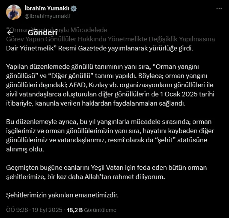 Orman Yangınlarıyla Mücadelede Görev Yapan Gönüllüler Hakkında Yönetmelik'te değişiklik yapıldı. Orman yangınlarıyla mücadelede görev alan gönüllülerin hakları güçlendirilirken, tanımları da netleşti. Bu yıl yangınlarda hayatını kaybeden orman işçileri, gönüllüler ve diğer vatandaşlar da resmi olarak “şehit” statüsüne alındı.