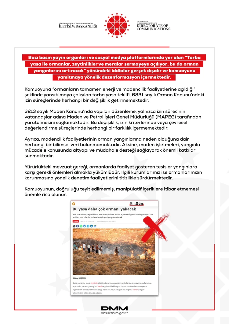 ANKARA (İGFA) - Cumhurbaşkanlığı İletişim Başkanlığı, bazı basın yayın organları ve sosyal medya platformlarında “Torba yasa ile ormanlar, zeytinlikler ve meralar sermayeye açılıyor; bu da orman yangınlarını artıracak” şeklindeki iddiaların gerçek dışı olduğunu ve kamuoyunu yanıltmaya yönelik dezenformasyon içerdiğini duyurdu.