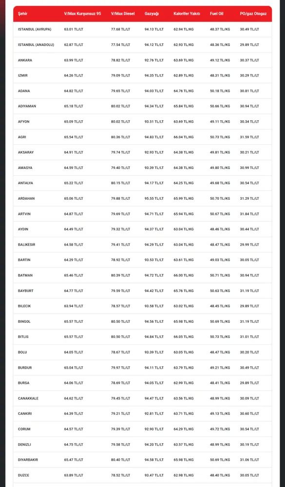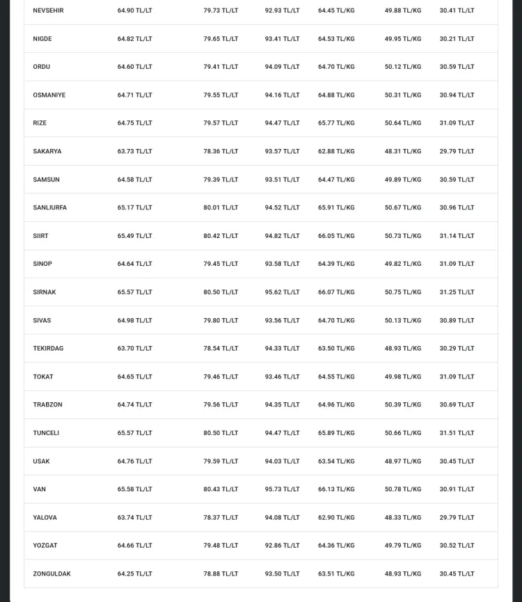 İşte an itibariyle 81 ilde akaryakıt fiyatları şöyle: