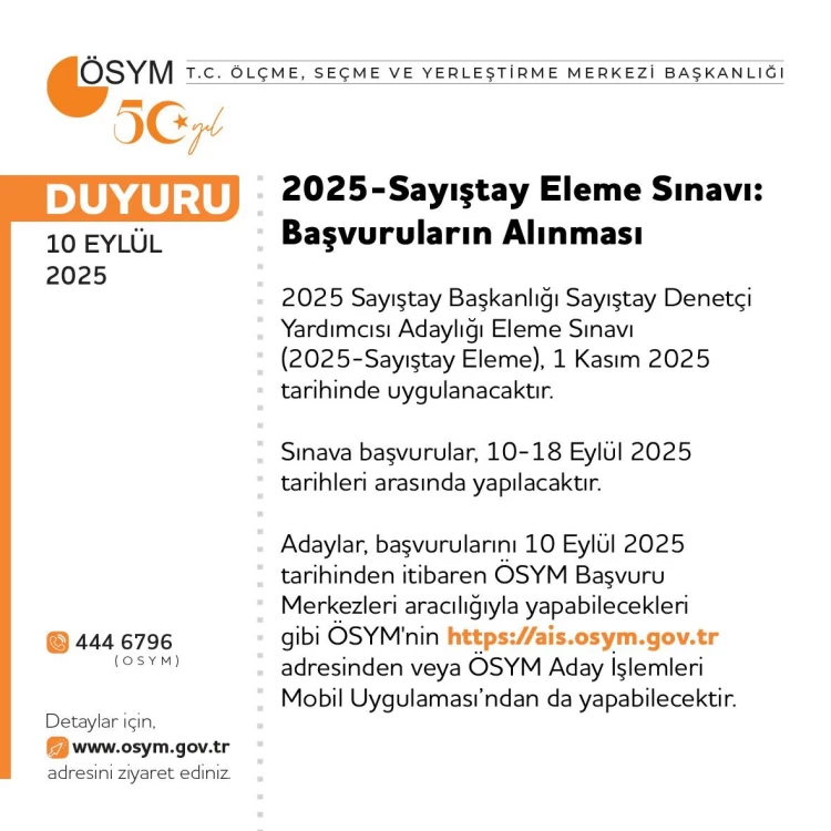 2025-Sayıştay Eleme Sınavı, 1 Kasım 2025’te gerçekleştirilecek. Başvurular, 10 Eylül 2025 saat 11:15’ten itibaren 18 Eylül’e kadar ÖSYM Başvuru Merkezleri, https://ais.osym.gov.tr adresi veya ÖSYM Aday İşlemleri Mobil Uygulaması üzerinden yapılabilecek. Adayların, sınav kılavuzunu dikkatle incelemeleri gerektiği vurgulandı.