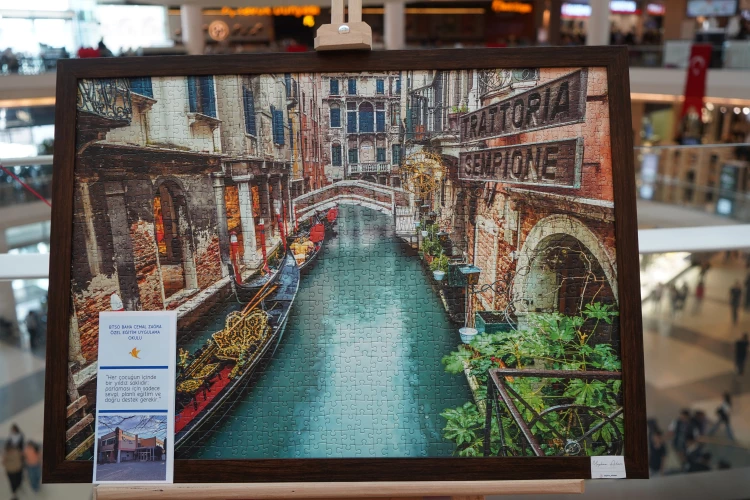 “Yapboz Adam” olarak tanınan Kerem’in, 3-4 yaşlarında fark edilen parçaları birleştirme yeteneği, öğretmeni Ahmet Nurlu’nun rehberliğinde sanata dönüştü. Ziyaretçiler, Kerem’in titizlikle hazırladığı yapbozları inceleyerek ailesi ve öğretmeninden bilgi aldı.