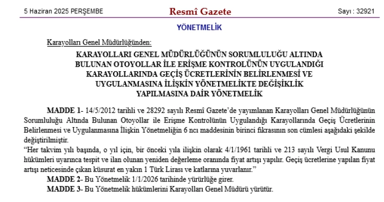 Yönetmeliğe göre, 1 Ocak 2026’dan itibaren her takvim yılı başında, bir önceki yıla ait yeniden değerleme oranı esas alınarak geçiş ücretleri otomatik olarak artırılacağı, artış sonrası ücretlerdeki küsuratın en yakın 1 Türk Lirası ve katlarına yuvarlanacağı kaydedildi.