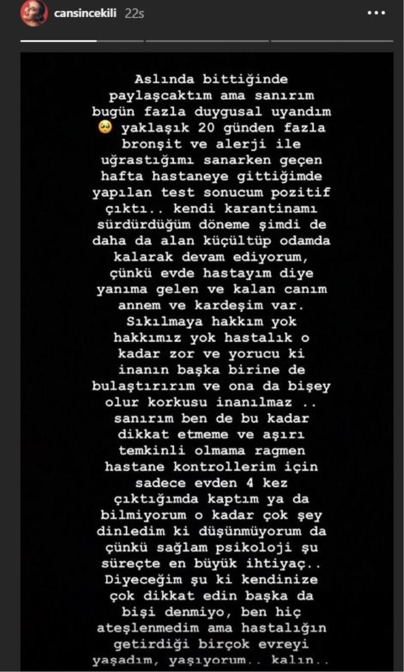 Açıklamasının devamında lütfen evde kalın diyen Çekili, "Yani bazen çok sevdiğiniz şeyler de size iyi gelmeyebiliyormuş bunu anladım. Sağlık diyorum çok önemli, zaten önemsiyorduk ama bunu daha da önemsediğimizi anlamak için böyle yaşanmışlıklara ihtiyaç duymayalım. Sağlıkçılara gelirsek hepsi o kadar özenli ki, bu süreçte günde kaç kere arandığımı bilmiyorum. Hepsi durumumu soruyor ve bilgilendirme yapıyorlar, onlara her gün ’asıl siz kendinize dikkat edin’ diyorum. Çünkü ben evdeyim ama onlar? Onlar evlerinde değil, inanın işleri zor dediğimizden çok daha zor. Neyse ben iyiyim, iyi olacağım. Evdekilerin test sonuçlarını alınca en azından rahatlayacağım. Umarım negatiftir. Siz de iyi olun ve lütfen evde kalın” ifadelerini kullandı.