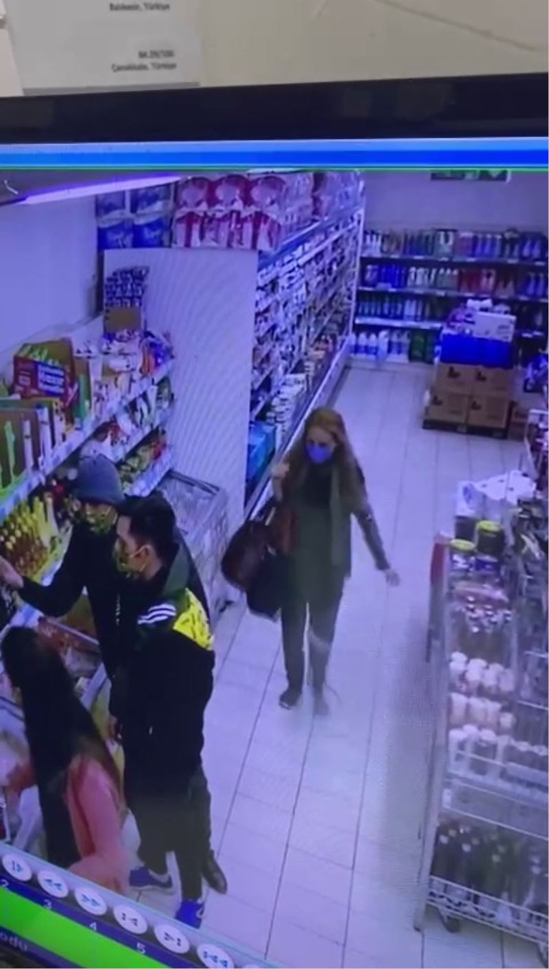 Markette hırsızlık anları güvenlik kamerasına saniye saniye yansıdı. Görüntülerde kadın şahıs reyondaki ürünleri çantasına atıyor. Ardından unutulan cep telefonunu çantasına atıyor. İki erkek şahıs da market çalışanını oyalıyor.