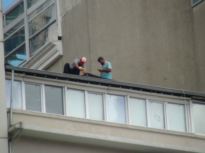 Taksim’de çatı tadilatı devam eden bir binada çalışan işçilerin güvenlik önlemi almadan görevlerine devam etmeleri kameralar tarafından kaydedildi. Hiçbir güvenlik önleminin alınmadığı tadilatta rüzgardan dolayı yere düşen mala paniğe sebep oldu.