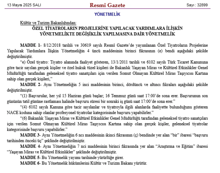 Bugünkü Resmi Gazete’de yayımlanan yeni düzenlemeyle, özel tiyatro tanımı genişletildi. Bundan böyle 6102 sayılı Türk Ticaret Kanunu’na göre tacir sayılanlar ve Bakanlık tarafından verilen Somut Olmayan Kültürel Miras Taşıyıcısı Kartı’na sahip geleneksel tiyatro sanatçıları da destek kapsamına alındı.