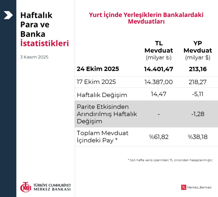ANKARA (İGFA) - Türkiye Cumhuriyet Merkez Bankası (TCMB), 24 Ekim 2025 tarihli Haftalık Para ve Banka İstatistikleri'ni yayımladı.