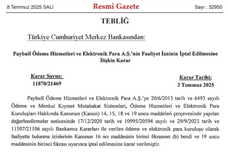 Türkiye Cumhuriyet Merkez Bankası, Paybull Ödeme Hizmetleri ve Elektronik Para A.Ş.’nin faaliyet iznini iptal etti. Karar, bugünkü Resmi Gazete’de yayımlandı.