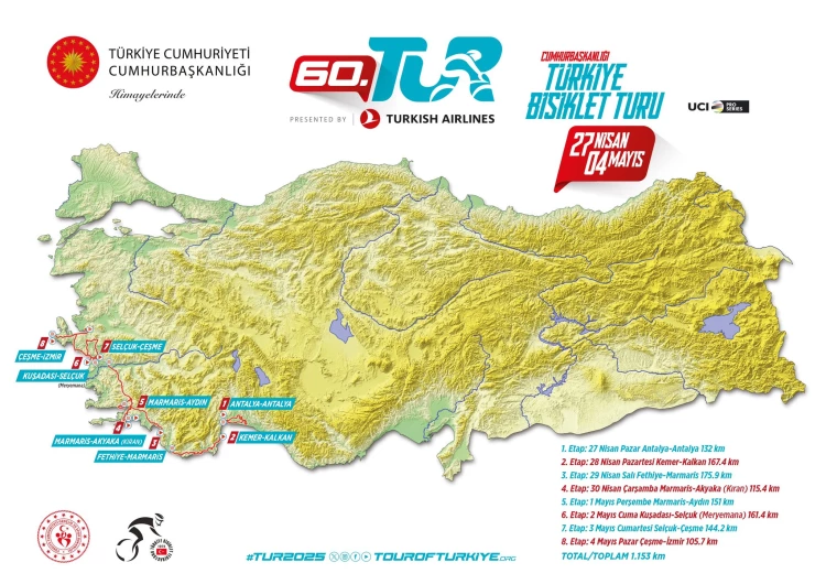 Uluslararası Bisiklet Birliği’nin (UCI) Avrupa Turları takviminde yer alan ve Türkiye’nin “ProSeries” kategorisindeki tek bisiklet yarışı olan 60. Cumhurbaşkanlığı Türkiye Bisiklet Turu, 27 Nisan Pazar günü Antalya’dan başlayıp 4 Mayıs Pazar günü İzmir’de sona erecek.