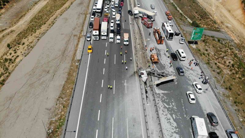 Pendik’te TEM Otoyolunda çimento yüklü kamyon, sürücüsünün direksiyon hâkimiyetini kaybetmesiyle bariyerleri kırarak karşı istikamete geçip devrildi. Devrilen kamyona çarpan bir tıra da arkadan gelen araçlar duramayarak çarptı. Yolun çimento ile kaplandığı kaza alanı havadan görüntülendi.