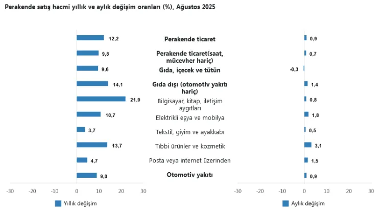 Türkiye İstatistik Kurumu (TÜİK) verilerine göre, 2025 yılı Ağustos ayında ticaret satış hacmi yıllık bazda yüzde 6,9, perakende satış hacmi ise yüzde 12,2 artış gösterdi. Aylık bazda ise ticaret satış hacmi yüzde 1,4 azalırken, perakende satış hacmi yüzde 0,9 yükseldi.