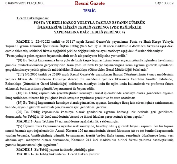 Ticaret Bakanlığı, posta ve hızlı kargo taşımacılığındaki eşyanın gümrük işlemlerine ilişkin değişiklikler yaptı. Yeni düzenlemelerle, eşya beyanında altılı tarife bilgisi eklendi, işlemler yetkili gümrüklerde yapılacak.