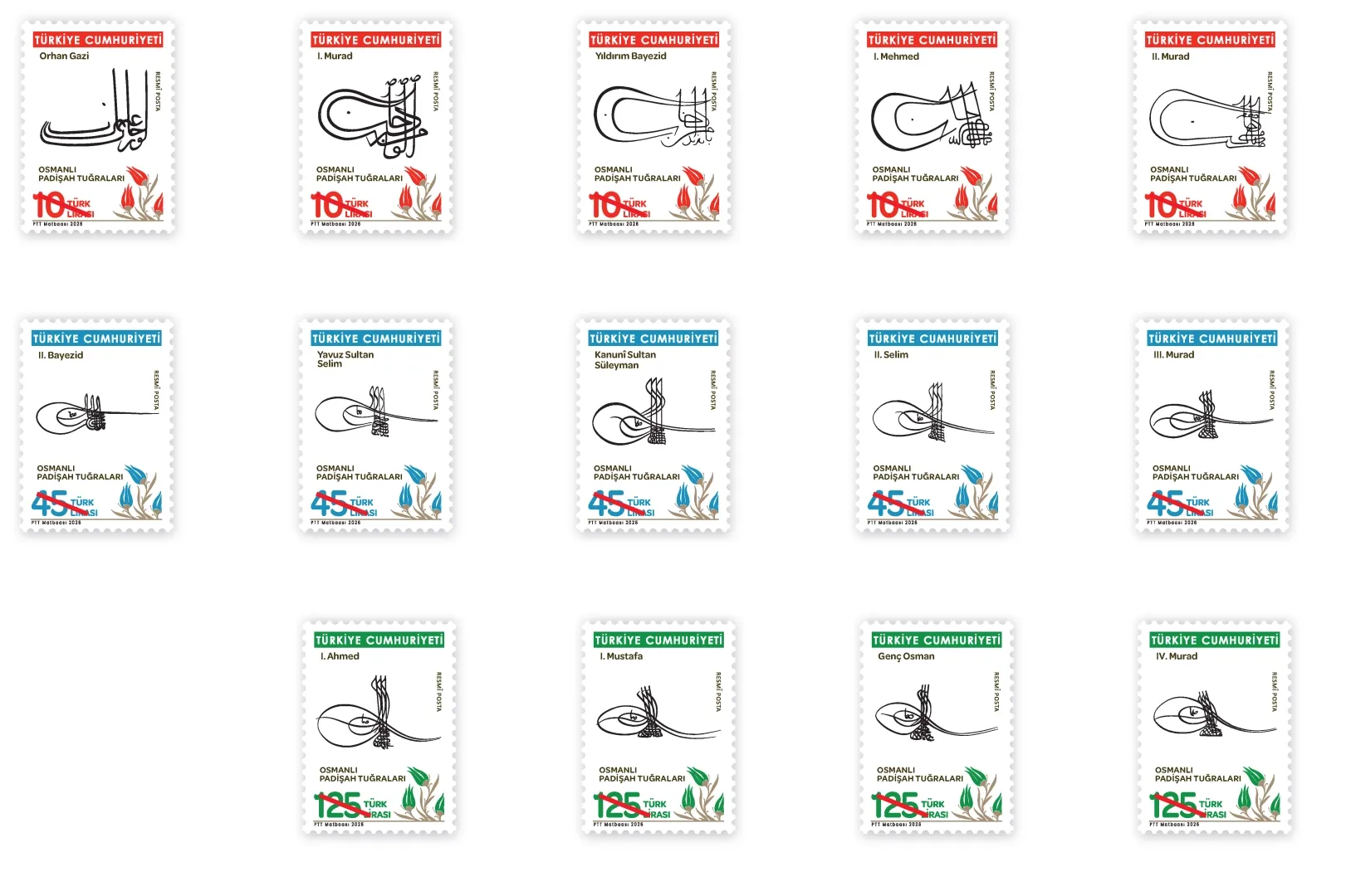 ANKARA (İGFA) - PTT AŞ, 3 Mart 2026 tarihinde “Osmanlı Padişah Tuğraları” konulu (26x36 mm boyutunda) 6 x 10 TL, 6 x 45 TL, 4 x 125 TL, 4 x 265 TL bedelli resmî posta pullarını PTT iş yerlerinde ve PTT AŞ’ye ait www.filateli.gov.tr web adresinde satışa sundu.