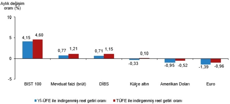 Aylık bazda en yüksek reel getiri, yurt içi üretici fiyat endeksi (Yİ-ÜFE) ile indirgendiğinde yüzde 4,15, tüketici fiyat endeksi (TÜFE) ile indirgendiğinde ise yüzde 4,60 oranlarıyla BIST 100 endeksinde gerçekleşti. Yİ-ÜFE ile indirgendiğinde mevduat faizi (brüt) yüzde 0,77, Devlet İç Borçlanma Senetleri (DİBS) yüzde 0,71 getiri sağlarken; külçe altın yüzde 0,33, Amerikan Doları yüzde 0,95 ve Euro yüzde 1,39 kaybettirdi. TÜFE ile indirgendiğinde ise mevduat faizi yüzde 1,21, DİBS yüzde 1,15, külçe altın yüzde 0,10 getiri sağlarken; Amerikan Doları yüzde 0,52, Euro yüzde 0,96 kaybettirdi.