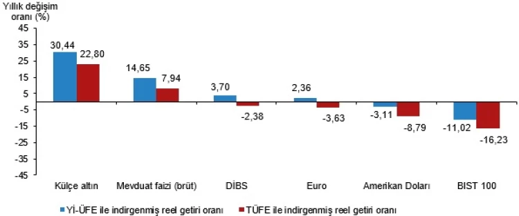 Yıllık bazda külçe altın, Yİ-ÜFE ile yüzde 30,44, TÜFE ile yüzde 22,80 oranlarında yatırımcısına en yüksek reel getiriyi sağladı. Yİ-ÜFE ile indirgendiğinde mevduat faizi yüzde 14,65, DİBS yüzde 3,70, Euro yüzde 2,36 getiri sağlarken; Amerikan Doları yüzde 3,11, BIST 100 yüzde 11,02 kaybettirdi. TÜFE ile indirgendiğinde ise mevduat faizi yüzde 7,94 getiri sağlarken; DİBS yüzde 2,38, Euro yüzde 3,63, Amerikan Doları yüzde 8,79, BIST 100 yüzde 16,23 kaybettirdi.