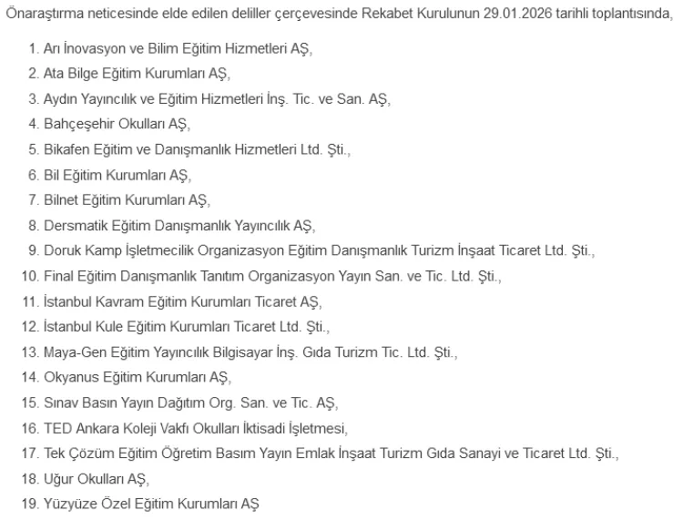 Elde edilen bulgular çerçevesinde Rekabet Kurulu’nun 29 Ocak 2026 tarihli toplantısında 19 teşebbüs hakkında 4054 sayılı Rekabetin Korunması Hakkında Kanun’un 4. maddesi kapsamında soruşturma açılmasına 26-03/73-M sayılı kararla hükmedildi. Soruşturma açılan kurumlar arasında Bahçeşehir Okulları AŞ, Bil Eğitim Kurumları AŞ, Bilnet Eğitim Kurumları AŞ, Okyanus Eğitim Kurumları AŞ, Uğur Okulları AŞ ve TED Ankara Koleji Vakfı Okulları İktisadi İşletmesi’nin de bulunduğu bildirildi.