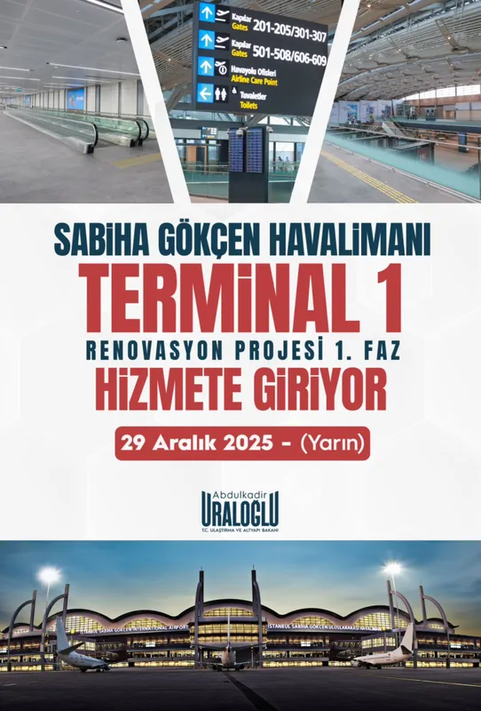 Ulaştırma ve Altyapı Bakanı Abdulkadir Uraloğlu, Sabiha Gökçen Havalimanı Terminal 1 Renovasyon Projesi’nin ilk fazının 29 Aralık Pazartesi günü hizmete açılacağını duyurdu. Proje, yolcu konforunu artıracak ve havalimanının kapasitesini güçlendirecek.